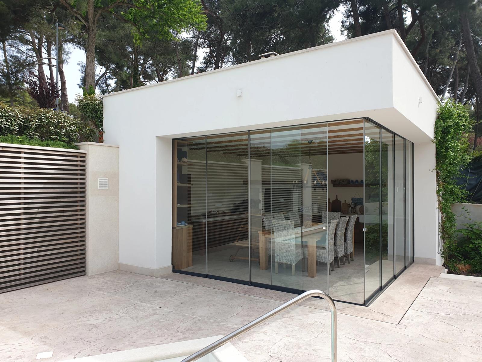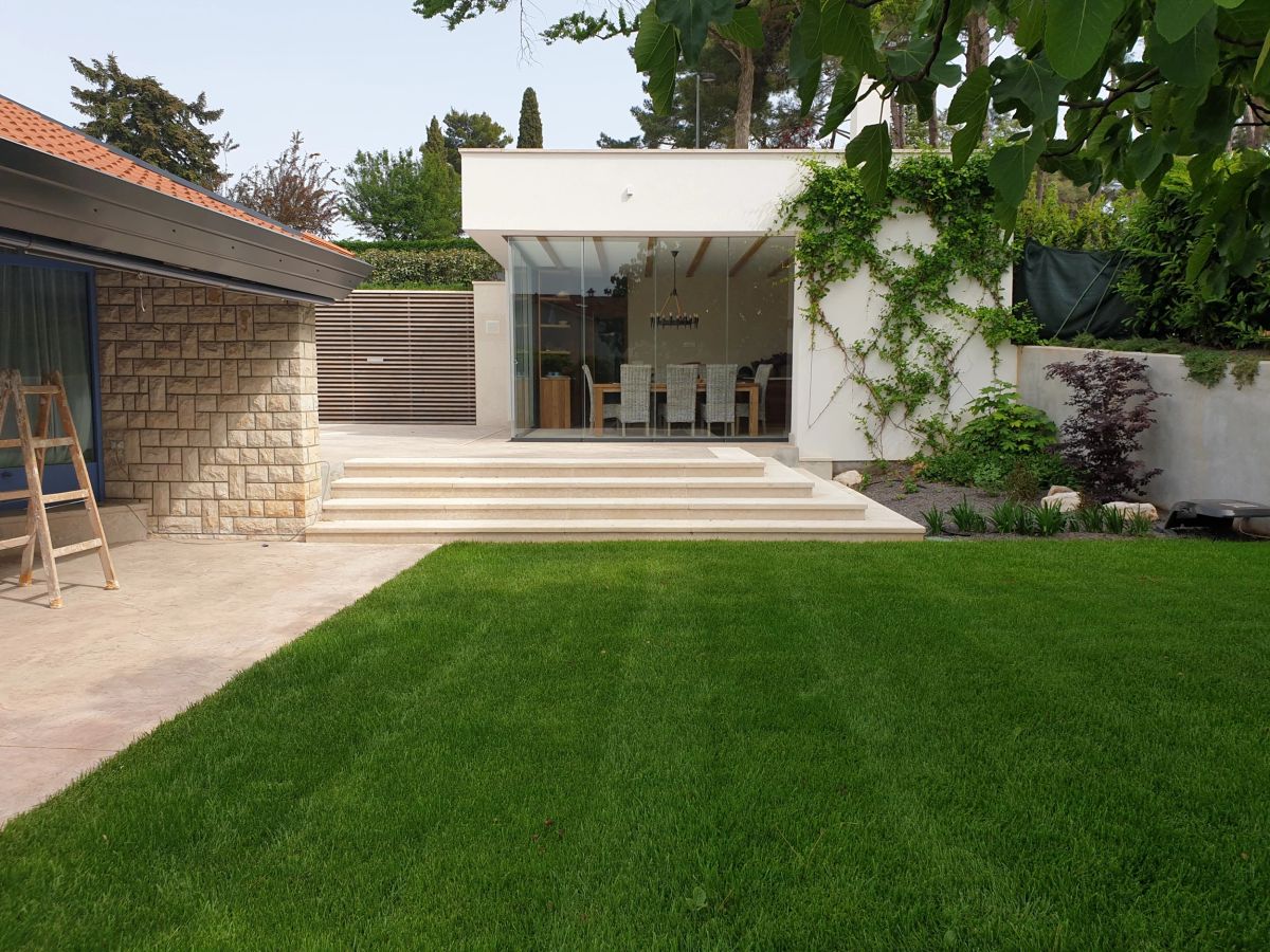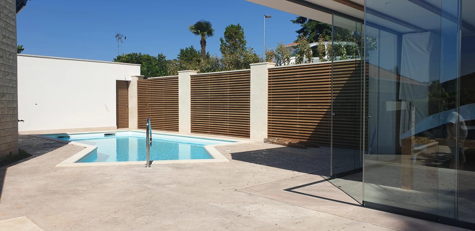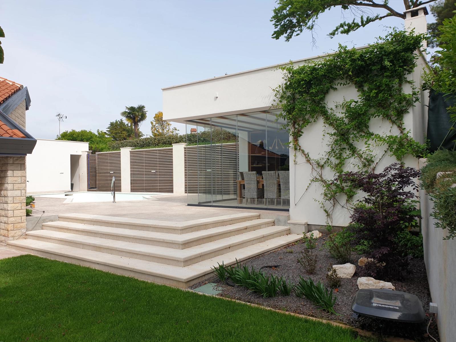 Moderna taverna s bazenom osmišljena je kao prostor za opuštanje na otvorenom. Jednostavan dizajn i prirodni materijali nadovezuju se na arhitekturu i stvaraju intiman središnji dio okućnice.