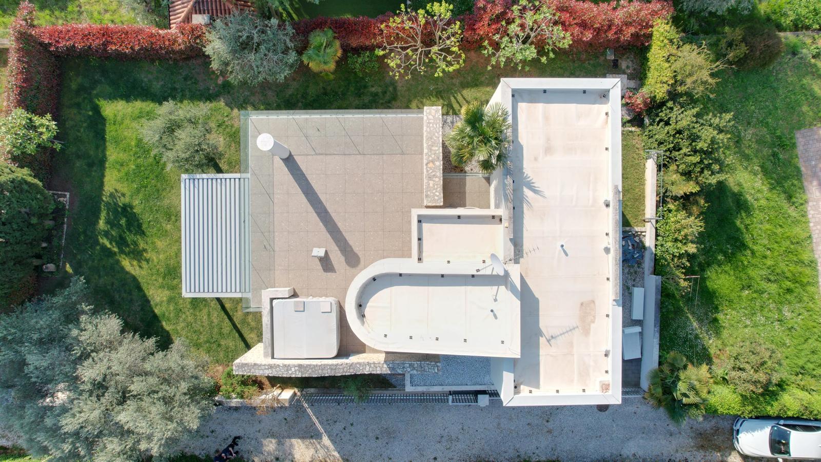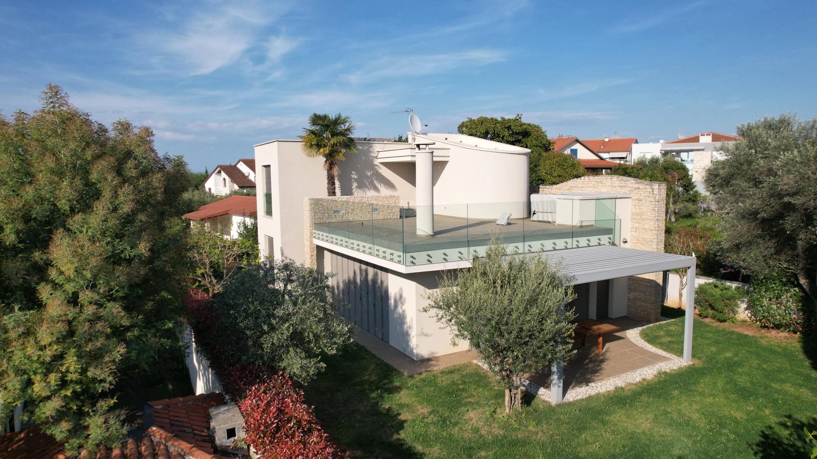 Vila u Bašaniji osmišljena je kroz dva funkcionalno odvojena volumena — jedan za boravak i druženje, drugi za miran odmor — međusobno povezana stubištem. Velika krovna i prizemna terasa stvaraju ugodan prostor za život unutar privatnog zelenila.